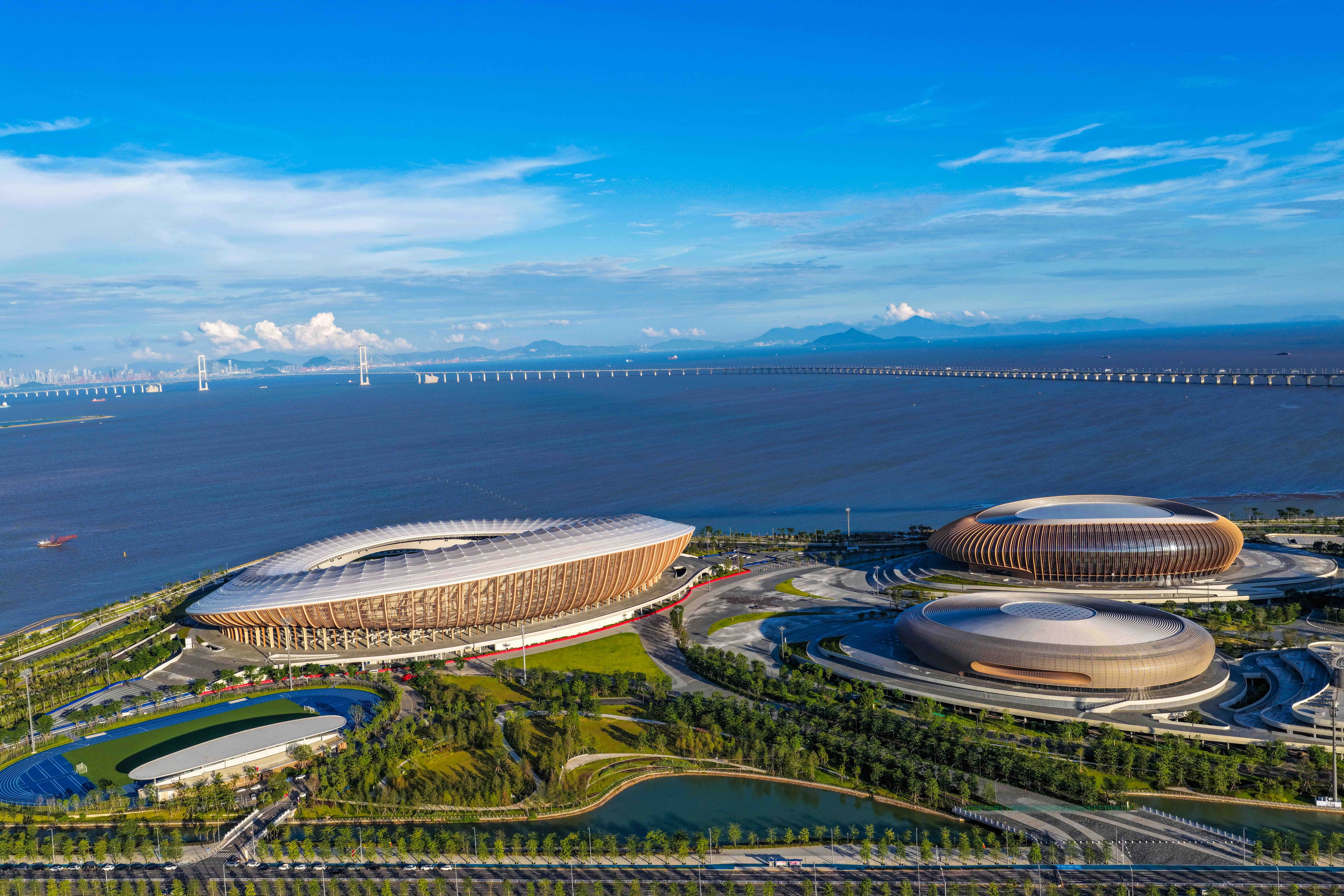 站在大湾区文化体育中心体育场,一个跨度约150米、高度约21米的大开口瞬间攫取视线——透过这扇“海景之窗”,伶仃洋的碧波万顷与深圳前海、深中通道的雄姿同框入画。“边看演出边看海”的独特体验,在这里成为现实。